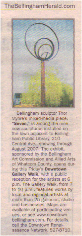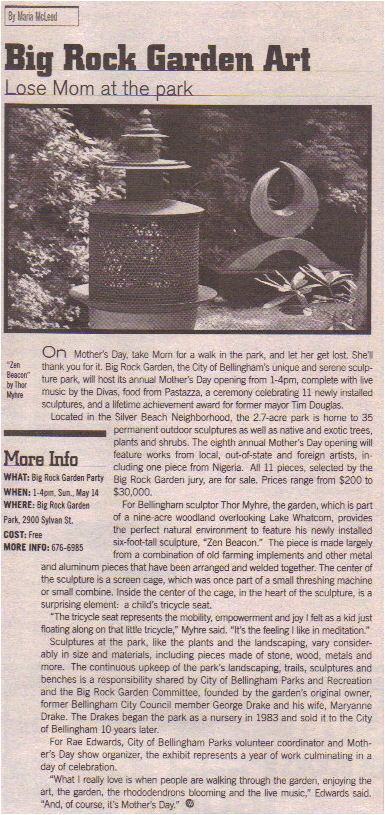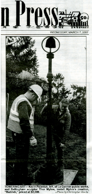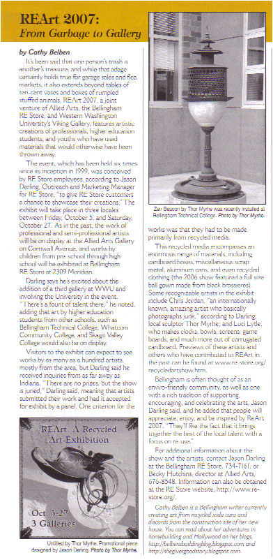 "It is pure joy to watch Thor Myhre find beauty in a trash heap. My favorite sculpture is Buddha; which shows so much grace and beauty of form -- from such a worthless start. No single piece does anything but scream of its junk origin, but, miraculously, the whole structure has a most powerful sense of dignity. That is a true definition of an artist."